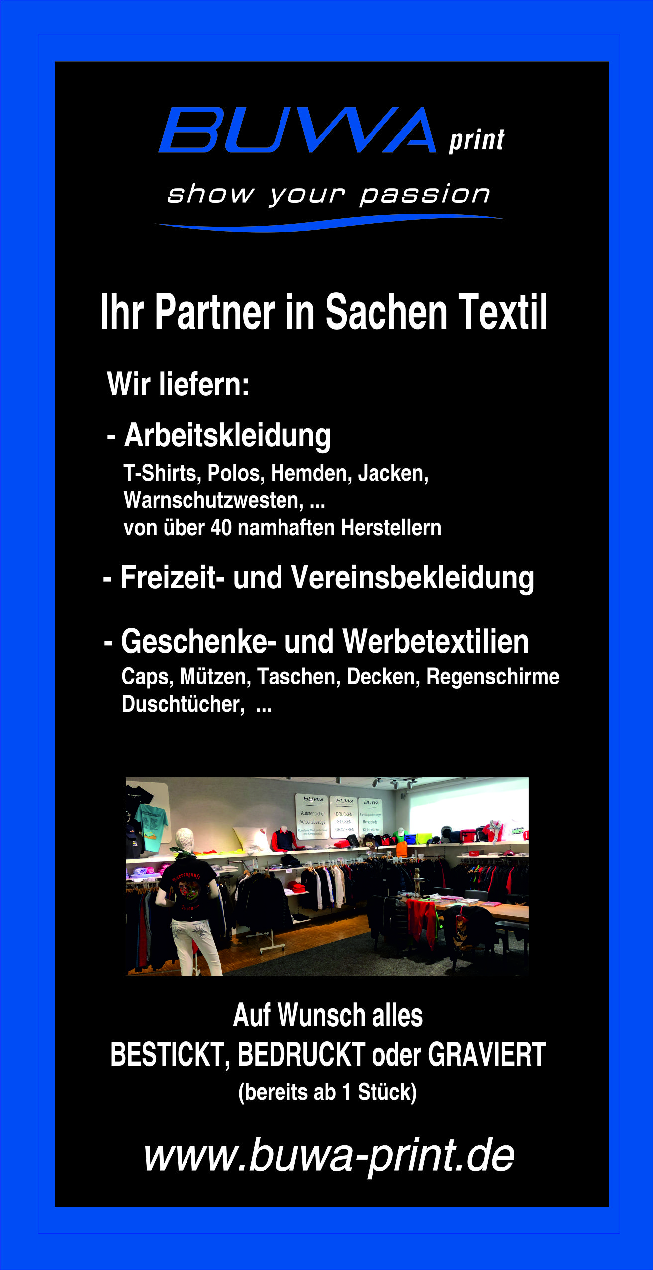 Ich war total von dem Verkaufsraum bei Buwa beeindruckt! Egal ob Textilien oder Werbemittel! Für mich immer die beste Wahl - alles aus einer Hand! Absolut problemlos!
